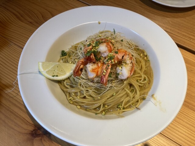 海老とピスタチオのアメリケーヌパスタ(大盛り) (季節のスープ・フォカッチャパン付)