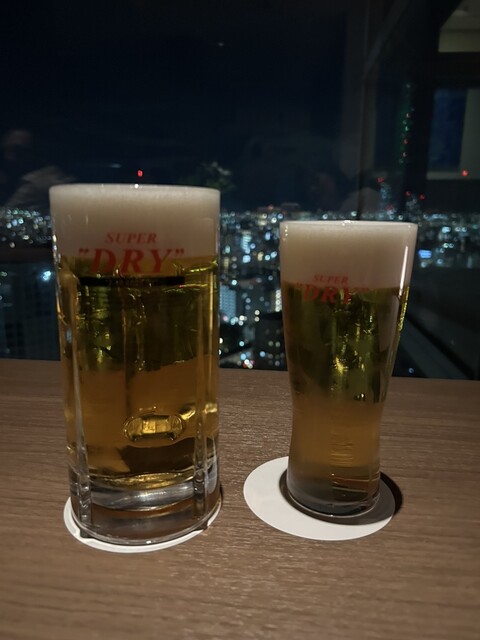 20時くらいで8割くらい埋まっていました。おつまみも色々あるようです。私たちは迷わずスーパードライのみ一杯ずつ。夜景をつまみに最高の景色とビールを楽しむことができました。