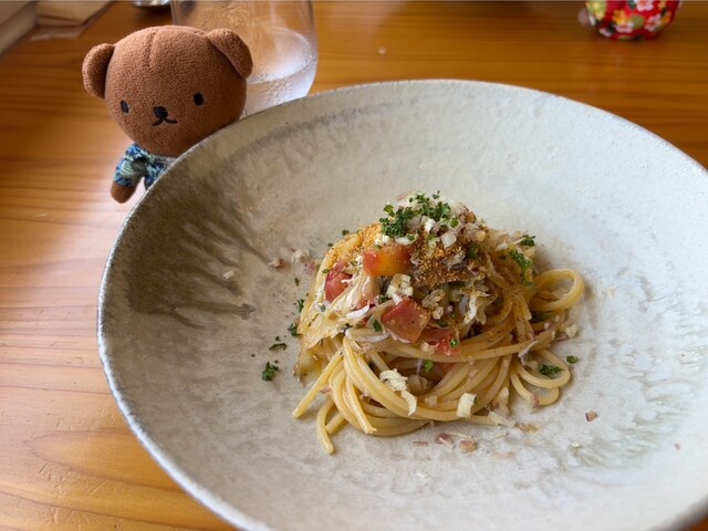 開店15分前に店下の駐車場で待機し開店と同時に入店。窓際の笛吹川と山々が見える席に通されてランチメニューを注文。二人なのでパスタを2種類とデザートを選択。パスタははるな豚と原木椎茸、しらすとミョウガのパスタにしました。味付け、アルデンテも最高でした。前菜のカンパチとサーモンのサラダ仕立て、とうもろこしのスープ、ズッキーニとスモモのサラダは想像を超える味で感動しました。