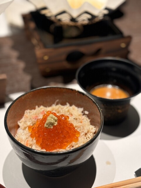 食事は蟹ちらし。ほぐし身がたっぷり敷き詰められ、上には輝くいくら。贅沢の極みで、最後まで蟹を満喫できる構成です。蟹味噌風味のお椀も、濃厚でコクがあり、余韻まで美味しい。