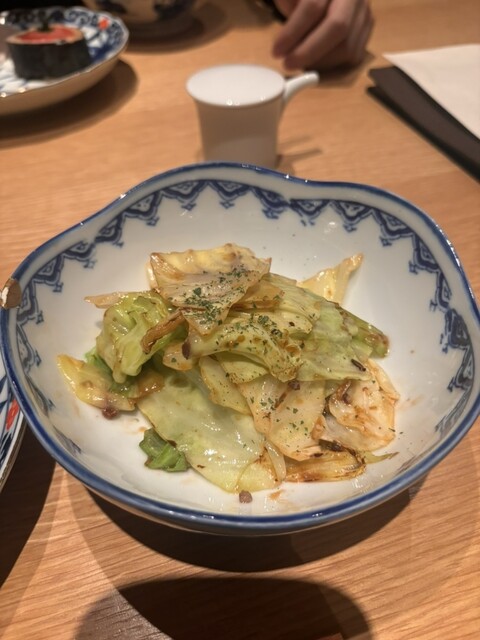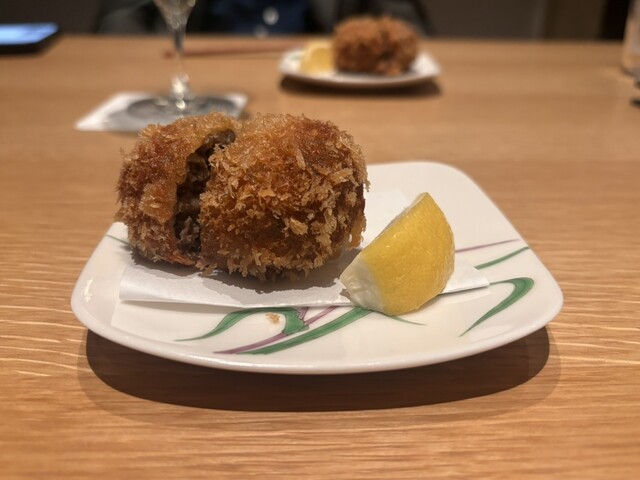 温菜はキャベツの酒盗炒めと、茄子と牛タンのおろしポン酢という組み合わせで、どちらもお酒が進む味。キャベツはシャキシャキ感を残しつつ酒盗の塩気と旨みがしっかり効いていて、日本酒でもハイボールでも相性が良さそうでした。茄子と牛タンのおろしポン酢は、ジューシーな牛タンにさっぱりとしたポン酢とおろしが合わさって、脂っぽさを上手にリセットしてくれる一皿。重めの料理が続くコースの中で、口直し的な役割も担ってくれます。