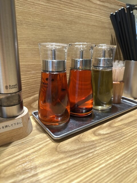 卓上調味料にはエビ油など考えられていてこだわりを感じる。