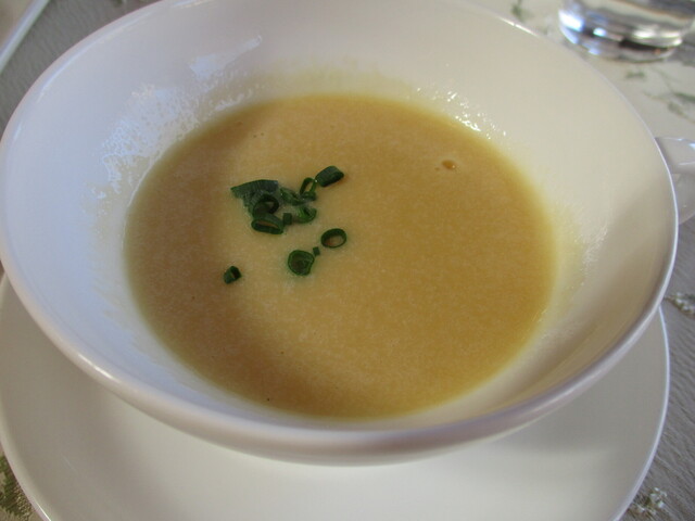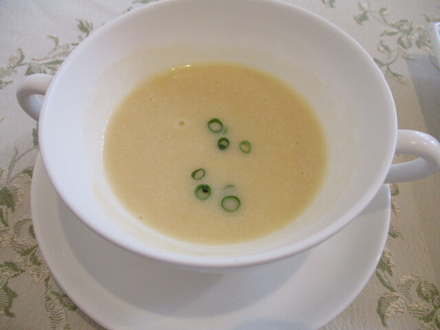 スープは、野菜のポタージュ。優しい上品な味。なめらかさと優しい味は手の込んだ手間をかけたスープ。ランチなのに、手をかけたスープを出してくれるシェフって、本当に料理が好きで、美味しい料理を食べさせるのが好きなのね。その気持ちに感謝しながらモグモグ。今日のスープは、好み!!