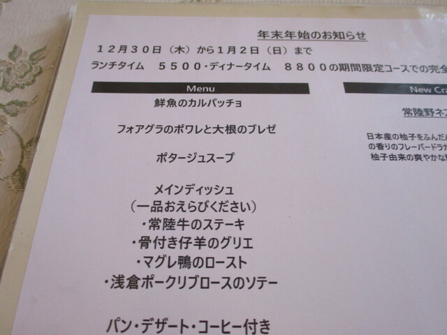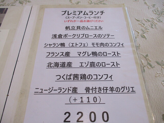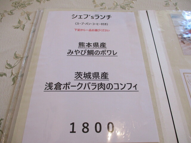 ランチは1800円から。スープ、メイン、ライスまたはパン、珈琲か紅茶がつきます。