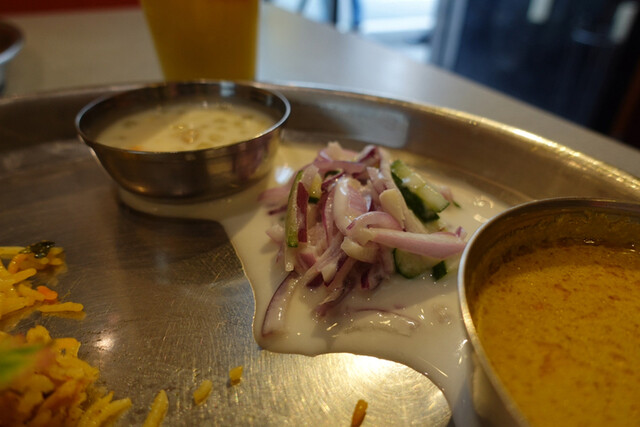 チキンビリヤニ、ベジミールス、マンゴーラッシーを注文。