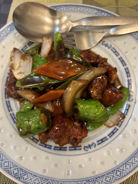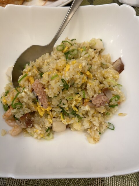 烏龍茶、ウニの入った玉子焼き、黒酢の酢豚、エビのガーリック炒め、五目チャーハン、ピラミッドお好み焼き、水餃子を注文。