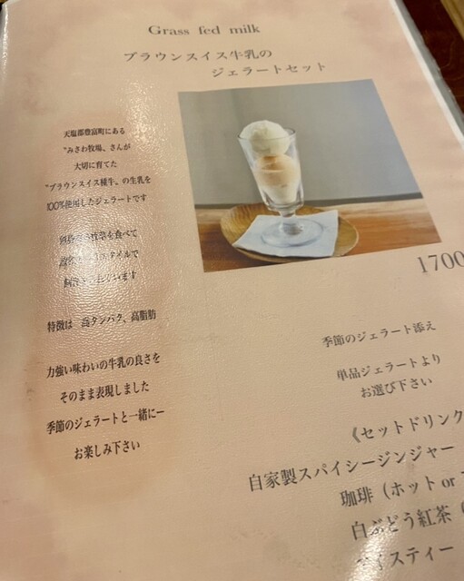 @2.,101 牛乳のジェラートセット 中の季節のジェラートはチョコ 白ブドウアイスティー @1,700