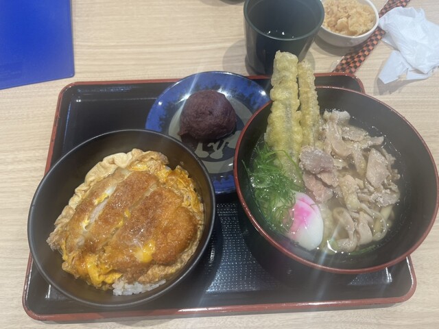 写真ば、肉ごぼううどん大盛りとミニ親子丼のセット と カシワごぼううどんとミニかつ丼とおはぎのセット