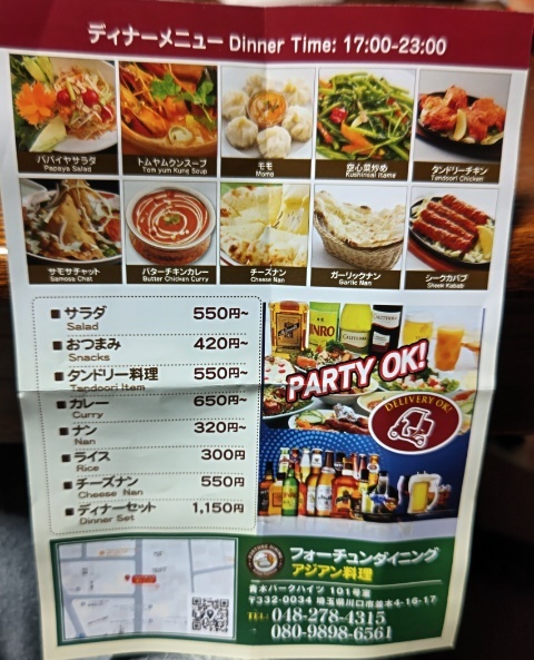 西川口のに新しいアジア料理屋のフォーチュンダイニングに行った。西川口駅の青木町公園の近くにあった。お店いはネパール国旗があるけど、看板にはネパール、インド、タイがあった。お店の人が「11/5、開店した」と話した。今回は店員は4人、シェフは]2人いた。リヤズで会っている人もいた。ダルバートはないなかあ?と話して、店の窓にある看板あるけど、メニュー表にはないと話した。とりあえず、ダルバートのネパールセット800円注文した。ダルスープ、チキンカレー、ミックスアチャール、サグ、サラダ、パパド、ジュースがセット。ダルスープは塩気が多く大好きで美味しい。カレーは旨いけど、ぬるく塩気がないのでインドカレーと思った。ミックスアチャールは美味しく、じゃが芋、胡瓜、グリーンピース、人参だと思う。サグは塩気が強くニンニクが多く美味しい。ライスは臭いがなく甘い、始める人でも好きだと思う。ホットチャイの味は濃いで、美味しい。おかわりをもらって腹がいっぱい、満足。価格は普通で、味は美味しい。