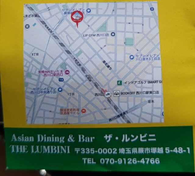 西川口のアジアンダイニング&バー ザ・ルンビニ行った。ザ・ルンビニは4/21(月)で開店したそうだ。蕨の塚越公園の近くだけど、西川口駅東口からで約20分、蕨駅東口からでも約25分、どちからでも遠い。野菜カレーでAセットとホットチャイ770円を注文し、後でチラシ50円OFFもらった。野菜カレーの味はネパールと思う、いっぱい野菜が多くて、じゃが芋、いんげん、レンコン、茄子、かぼちゃ、マッシュルーム、ピーマン、紫玉ねぎのカットと更にマスタードオイルがかけている。こんな多い野菜が入っているカレーを他の店で見たことない、すごく美味しい。ライスの味と量は普通。オレンジ色のサラダは普通。ホットチャイは熱くて、味は濃いので美味しい。すごく美味しかった、次回は何を食べようかなぁ。