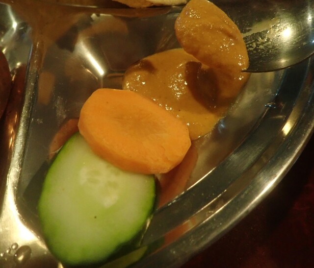 チキンカレーには骨付き肉が、8個があった。塩気は普通で、すごく美味しい。ダルスープの塩気は普通、美味しい。タルカリ中身はじゃが芋、人参、いんげん、グリーンピース、さらにまっ黒な唐辛子が入っているけど辛いはない。甘く美味しい。チャトニはちょっとだけ辛い、今回のチャトニは何だろう、他店のチャトニでは、食べたことがない。ライスの味は普通、量も普通。おかわりに、ダルスープとライスをもらった。もう腹いっぱい。食べた後、ホットコーヒーか、もらった。コーヒーはあっついので、私は好き。次回食べに行きます。セグとアチャールはないけど、肉か、多いので大満足。
