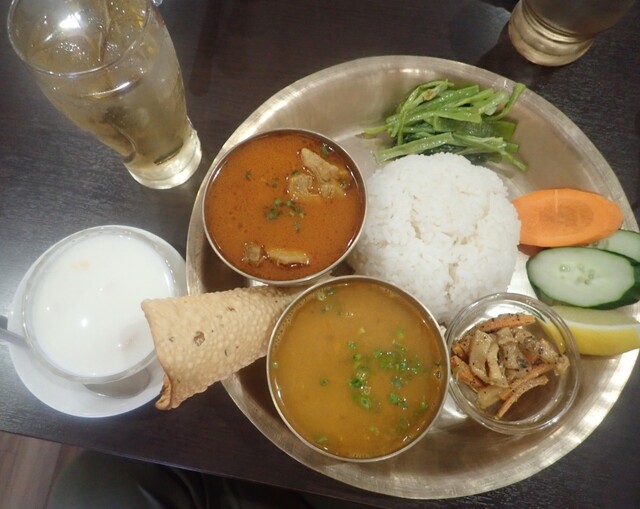 他店では、おかわりを「ライスとダルスープ」をもらうけど、今回では「ライス、ダルスープ、カレー(肉は小さく入っていた)」をもらった。腹いっぱいなっちゃた。