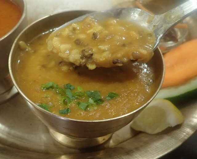 後、普通のダルでなく「まかないダル」を頂きました。「まかないダル」は、ひよこ豆、トマト、ピーマンが入ってように思う。野菜がすごく柔らかので、ひよこ豆以外は分からない。味は甘く、野菜と豆が柔らかく美味しい。2種類ダルで、私は「まかないダル」の方が好き。