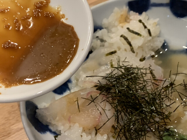 セットには、茶碗蒸しとお魚の酢漬けと赤だしがついてました。醤油だけでなく、胡麻だれもあり、最後はお出汁を注文して出し茶漬けにして、大満足!