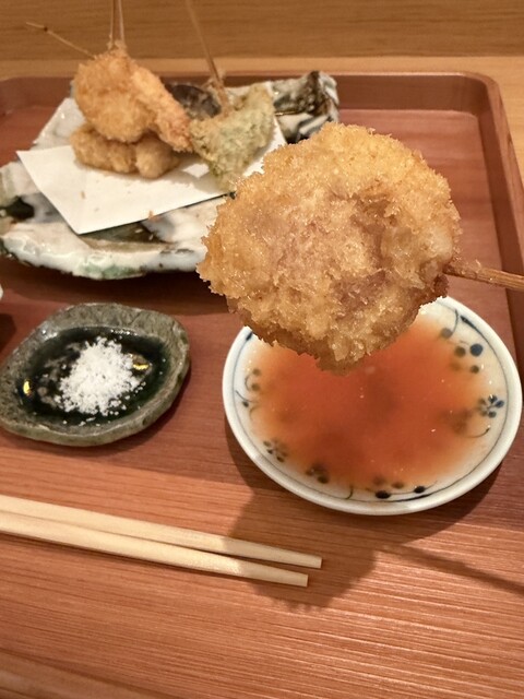 #串揚げ ソースが、とんかつ、塩、トマトベースと贅沢に。揚げたての串揚げはあっつあつで。トマトベースのタレはそのまま頂いても美味でした