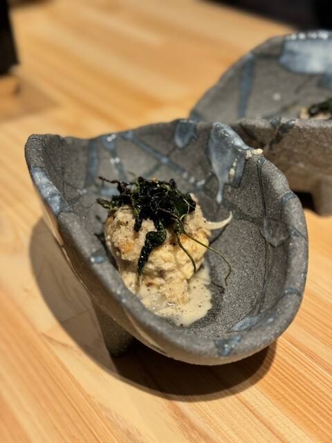 (備長炭オイル、鱧肝とコチュジャンソース)