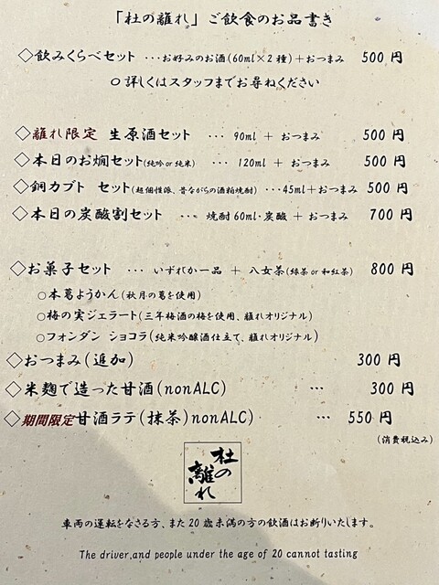 築130年の素敵な日本家屋で、定番のお酒や季節のお酒、杜の離れ限定酒などを購入することができます。飲みくらべセット(500円~)は2種のお酒とおつまみのお得なセット。お菓子と八女産の緑茶・和紅茶を楽しめるセット(800円)もあるので、お酒に弱い人やドライバーも安心です。