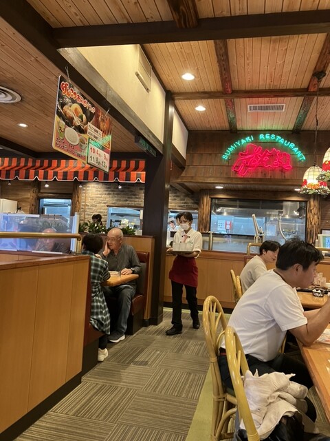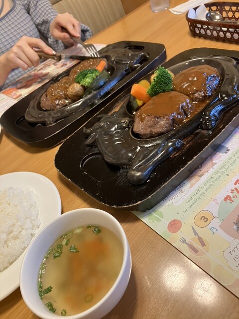 お店は結構満席で待ちました。ハンバーグは運ばれてきた時はげんこつ状態でしたが、店の人が切り分け調理してくれました中身は少しレアですが他では味わえないジューシーな食感のハンバーグでした最後まで美味しく頂きました
