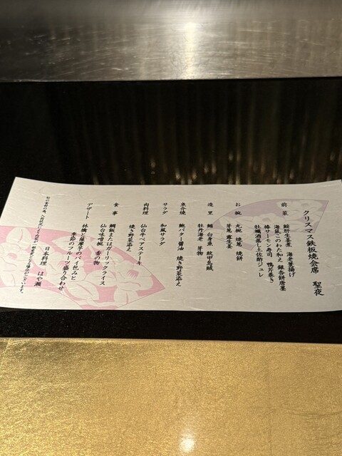 クリスマス特別メニューの、鉄板焼会席の聖夜というコースでリッチな食事を堪能してきました。今年を締めくくる,今年のご褒美として。流石に見た目も味も、さらには鉄板で焼く音も,全てが最高級でした。