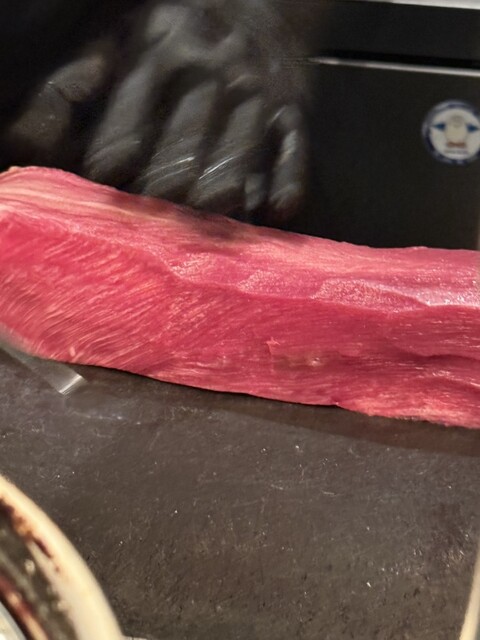 お肉をちょうど良い焼き加減で提供していただける、カウンター席で、お店のスタッフの方が高級肉をカットしたり、味付けたりするのを眺めながら、一品一品、説明を受けた後に、いただくというスタイルです。フルアテンドコース(飲み放題で焼いてもらって10000円というリッチなコース)にしました。