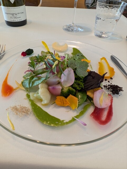 こちらがスペシャリテ。ミシェル・ブラスとはフランスのミシュラン三ツ星シェフ。小さな村で自然との対話を重んじ、料理に取り入れています。ガルグイユは彼のスペシャリテである野草料理で、数十種の野菜、香草、花、茸を絵画のように盛りつけた逸品。その鎌倉バージョンですね。ちょっと数えきれない温・冷野菜やエディブルフラワーに、添えられた色とりどりのソースがパレットに出した絵の具の様。ブラックオリーブ・ヘーゼルナッツ・パプリカ・ビーツ・人参・からし菜など多種。
