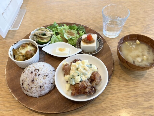 メインの塩麹チキン南蛮はお肉が柔らかくて、自家製タルタルソースがかかっていて、食べ応えがありました。副菜にも麹や味噌が使われていて、特にクリームチーズのゆず味噌は発酵食品同士、相性抜群でした。お味噌汁にはとうもろこしがはいっていて、夏らしいお味噌汁でした。