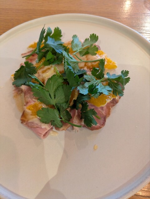 私はスズキと白茸のカルパッチョ(お名前違うと思います。すみません。。。)でママ友ちゃんパクチーとみかんはとハム(お名前忘れてすみません。。。)オーダー!