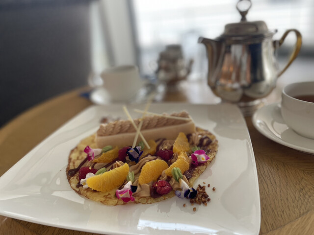 海側のテーブル席へご案内していただき、期間限定のケーキと紅茶を注文しました。紅茶は、オリジナル紅茶で香りがあり美味しく、ケーキは見た目はもちろん華やかで映えしますが、アイスケーキもクレープもとても美味しくいただけました。