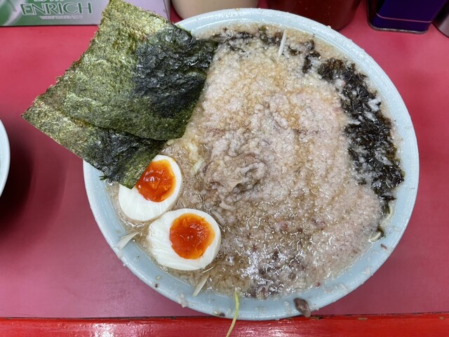 相変わらずラーメンは期待通りのビジュアル。脂のこてこて感がたまらなく青のりがマイルドなアクセントになってあまりくどさを感じない。