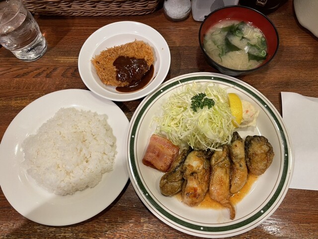 カウンター席に案内されて更に待つこと10分弱で注文したカキバター焼き定食とミニメンチが配膳。