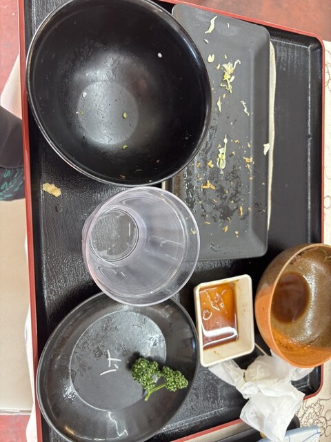 オーダーして10分弱で天ぷらが到着、間もなくして着丼し、器でテーブルが埋め尽くされます。