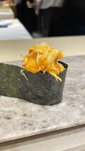 握り:金目鯛、剣先烏賊、本鮪赤身、本鮪中トロ沢庵海ぶどう巻、どんちっち鯵、車海老、鱚、毛蟹と雲丹軍艦、煮蛤
