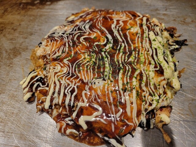 鉄板の上で食べるお好み焼き、ねぎ焼きハフハフ最高です