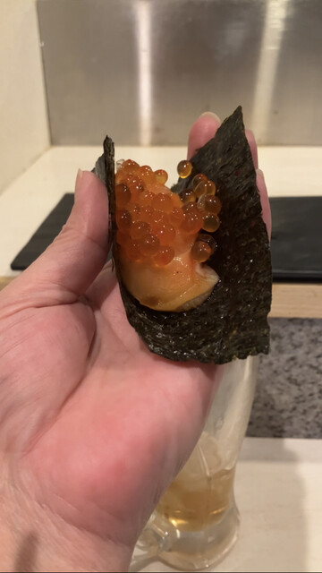 女性鮨職人の笑顔と共に渡されたサーモンいくら❣️もう幸せ〜❣️スマイルのおかげで大好きなサーモンいくらがより美味しく幸せを感じました❣️