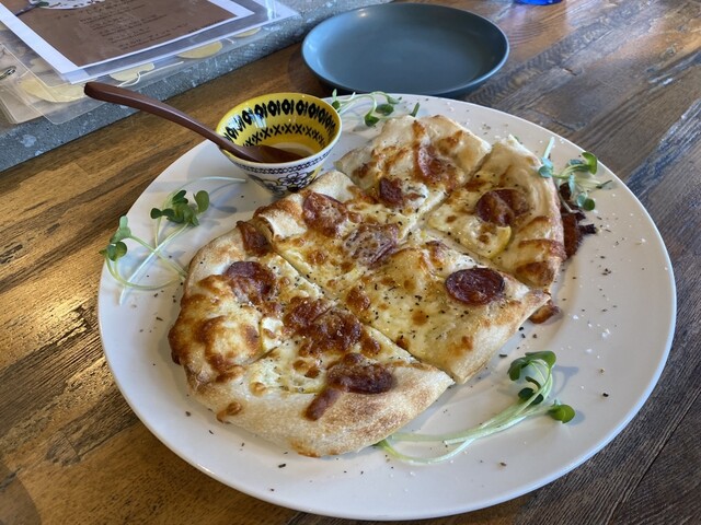 ふたりで伺い、ピザとケーキを注文。シェアする用に分けて出してくださいました。お味は美味い!季節のレモンがいい感じにアクセントになっています。ピザはパリッとモチっとした絶妙な食感。ケーキは色鮮やかでちょうどよく甘い。