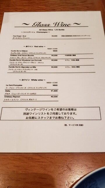 普段はワインもグラスで千円弱~三千円位、ボトルも一万円弱からで赤白様々。一人だと尚更にグラスワインの選択肢が多いのは嬉しいところ。しかもグラスは5杯どりだから大盛りです。