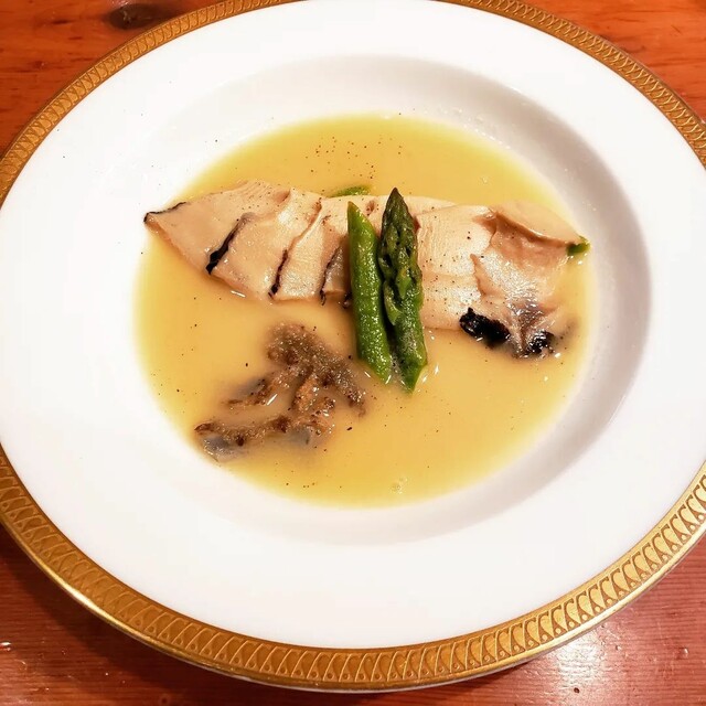 前菜はエスカルゴのソテー。正統派フレンチでもほとんど見なくなりましたよね。。蟹のスフレのアメリケーヌソースなど、本格的な洋食もあり、前菜は鮑の肝和えだったりと和テイストもあります。いつも期待に応えて予想の先を行く(いい意味で予想を裏切る)、サービサーとしての気概を感じさせてくださるお店です。