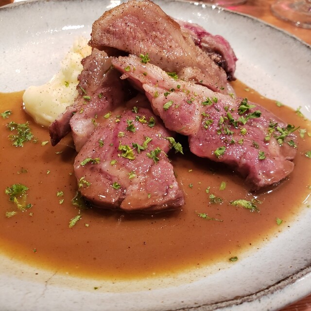 メインは牛や鴨など選択肢あり、飲みたいワインに合わせてメイン決めたり、逆にメインに合わせてグラスワイン決めるのもありですね。赤ワインが進みました。