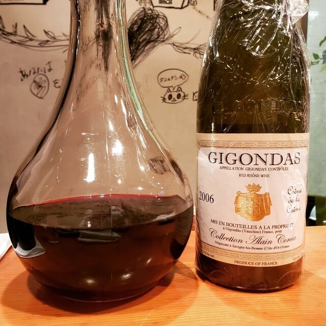 ジコンダスをボトルでオーダー。シャンパーニュみたく村名のワインです。これはグルナッシュ50%+、シラー10%+との制約はありますが、フレンチとは牛肉以外はしっかり合わせられます。写真一枚目は2006年としっかり熟成ですがこちらでは17,000円ちょいでした。グラスオーダーも出来るジコンダスもあります。