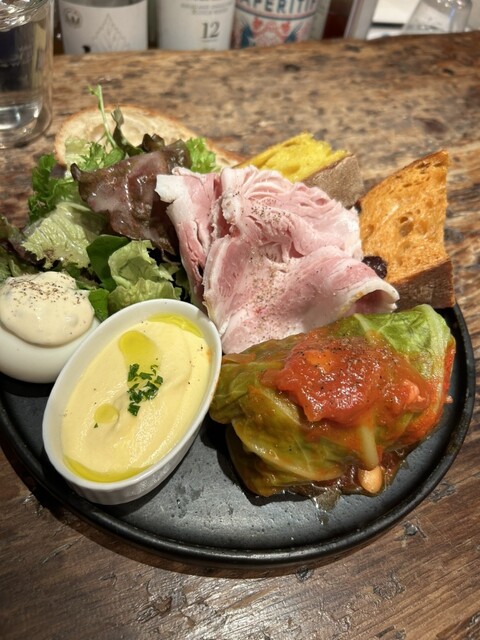 山盛りのサラダと前菜、パンが3種のっています。