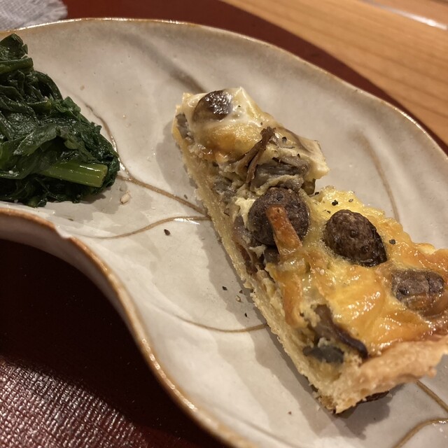 次に、本醸造梅乃宿とは、高野豆腐や牛すじの炊き合わせ。すじ、柔らかかったです。零余子と舞茸のキッシュと春菊。これも野菜がいい香り。