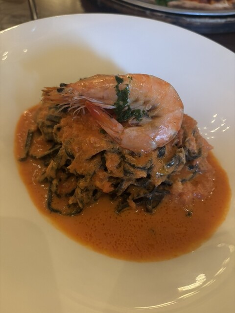 カクテルとスープ、パスタ、ベジタリアン向けのピザを注文しました。