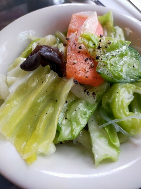 サラダは塩と酢と油?だけのシンプルな感じだけど、病みつきレベルで美味しい。