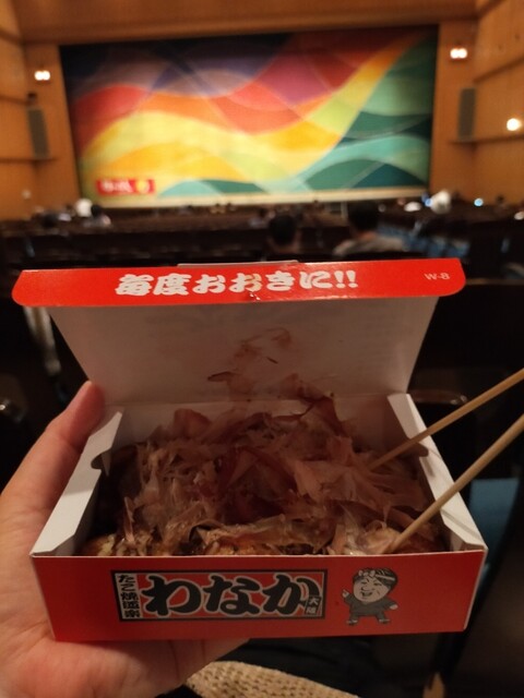 劇場はありがたいことに持込飲食OKとのこと。オーソドックスな8個入りと、気になっていたたこせんをテイクアウトして、早速開演前の座席でいただきました。