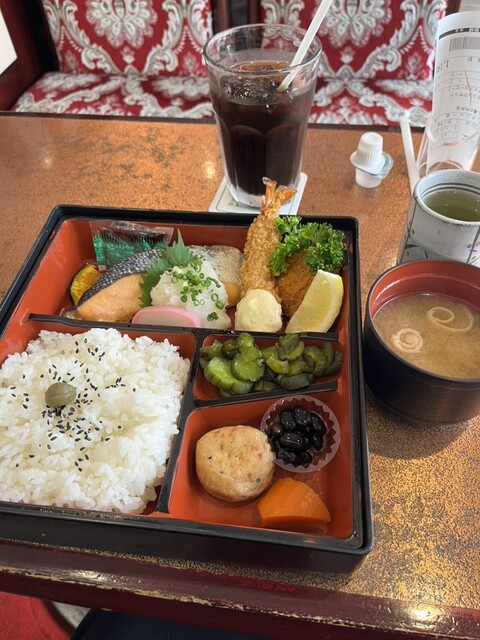 大きめな鮭が入ってエビフライ、メンチ、漬物、煮物