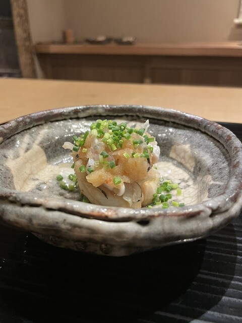 ②淡路島仮屋のハモ湯引き梅おろし黄ニラ添え