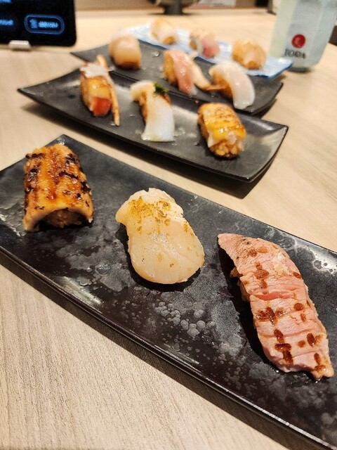 メニュー:炙り中とろ、炙りほたて、炙りあなご