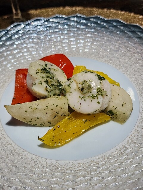 鉄板で野菜と肉厚のホタテを自家製エスカルゴバターで仕上げ、新鮮でよかったです。