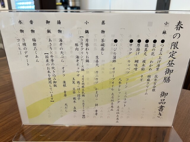 お蕎麦がメインと思っていましたが、春の限定御前1600円、レジのところで事前に精算を済ませ予約専用エリアに案内されました。大きな和造りの広々とした店内、外には姫路のゆったりした田舎の風景、贅沢な空間です。配膳された内容が贅沢すぎて、また、味もしっかりしており、値段が倍でも納得してしまうレベルのお得なランチでした。春は芝桜ですか、夏前には水蓮も有名と聞きました。ヤマサ蒲鉾さんの揚げたてさつま揚げ類の購入もしかり、こちらのレストランも間違いなく再訪決定です。納得感が半端ないレベルでした。
