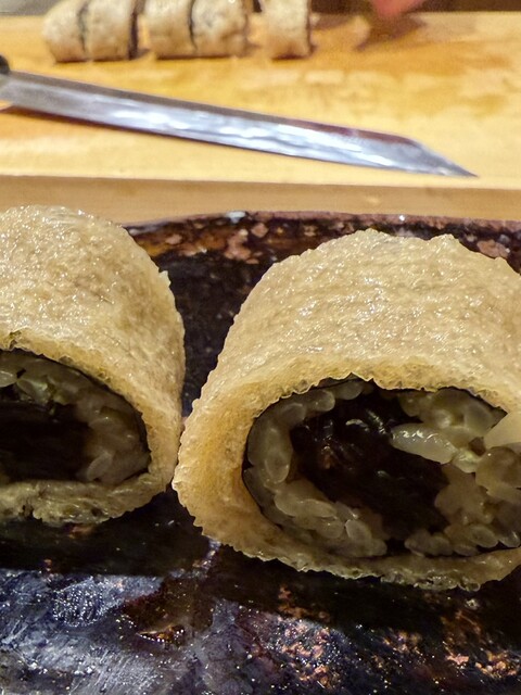 Alongside kani-salad rolls, the meal ended with their signature: kampyo maki wrapped in inari.